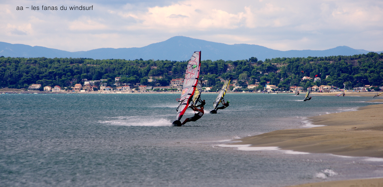 Vendredi,Le Rouët. Situation estivale trés courante , le vent souffle au nord, à partir de La Palme et au sud quasi rien. Donc nous voilà dans 35 noeuds de vent au Rouët. Heureusement le sable ne vole pas trop humidifié par les pluies d'hier, une aubaine. Toutoune ayant oublié ma voile vintage fétiche, je suis obligée de mettre une voile de vague sur le gun ce qui est beaucoup moins confortable, surtout avec un vent aussi rafaleux et bien nord-ouest.Pas facile de prendre des photos avec le petit diable qui court partout et certains n'en auront malheureusement pas. Il ne fait pas si chaud que çà par contre et le plan d'eau est quelques fois bien clapoteux.Une session dure mais belle.