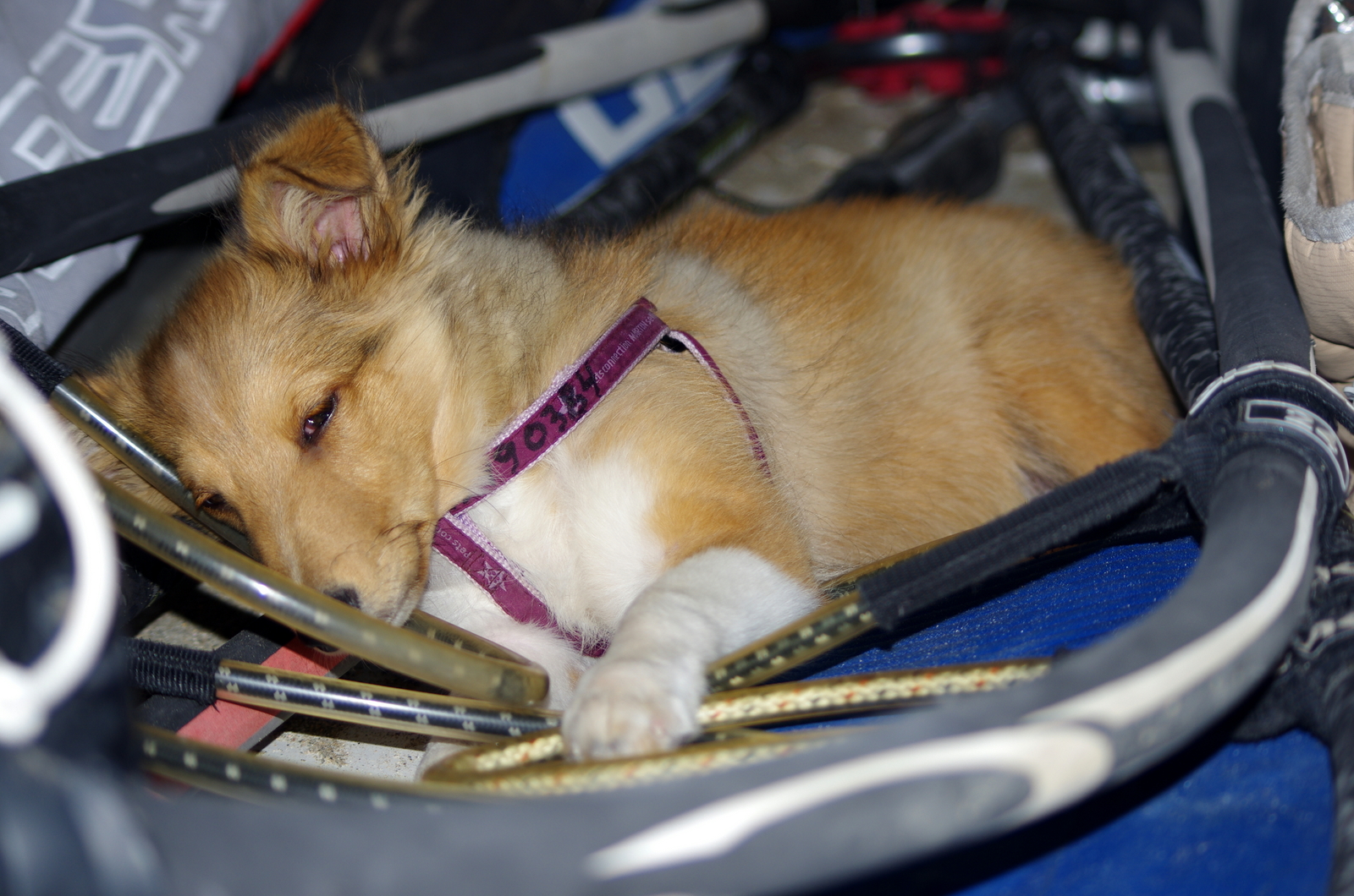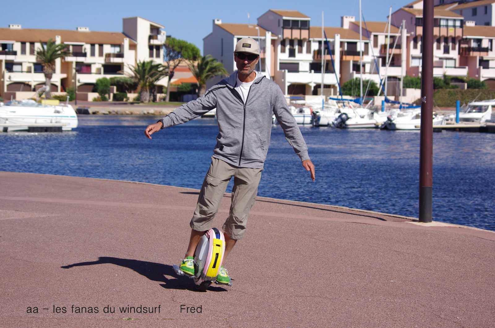 Jeudi,Barcares. En fait tout avait commencé à PLN,en arrivant nous voyons Sam se régalé ce sera bon...mais à peine le matos sorti le vent ressoufle en rafales de nord, 40 noeuds de nord pour quoi faire???? c'est là que je prend la mauvaise décision, que je ne regrette pas car les yeux de petit Lucky étaient en danger avec cette tempête de sable!!!mais en arrivant à Barcarés grosse désillusion, rien nada, par moment des gros coups de vent puis plus rien, je n'ai pas de grosse planche (j'étais partie pour PLN faire du slalom) je n'ai que ma 74 litres mais je vais quand même faire quelques bons bords en 4.5. Quand le vent nous fait défaut il y a toujours une solution pour glisser, la preuve Fred et son engin du feu de la terre!! trés élégant. Quant à Lucky ben il est bien installé.......