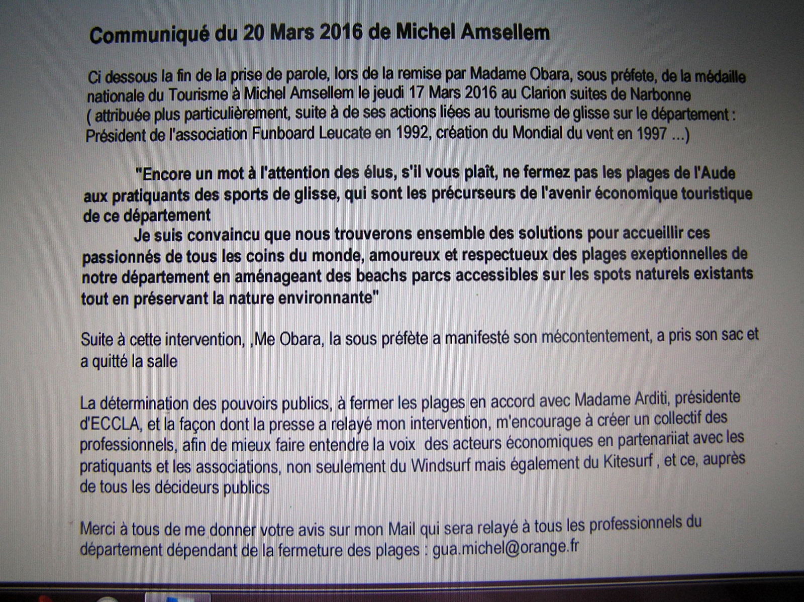 Jeudi 17 mars Michel Amsellem recevait la Médaille Nationale du Tourisme, pendant cette cérémonie il est intervenu pour demander que l'on ne ferme pas les plages de l'Aude aux pratiquants des sports de glisse, réponse de la préfete?? elle a pris son sac et est partie!!!Voilà qui est plus que révélateur!Lisez le texte ci-joint et répondez à Michel par mail à l'adresse qu'il donne, c'est trés important , quand quelqu'un de son statut veut nous aider il faut l'aider.