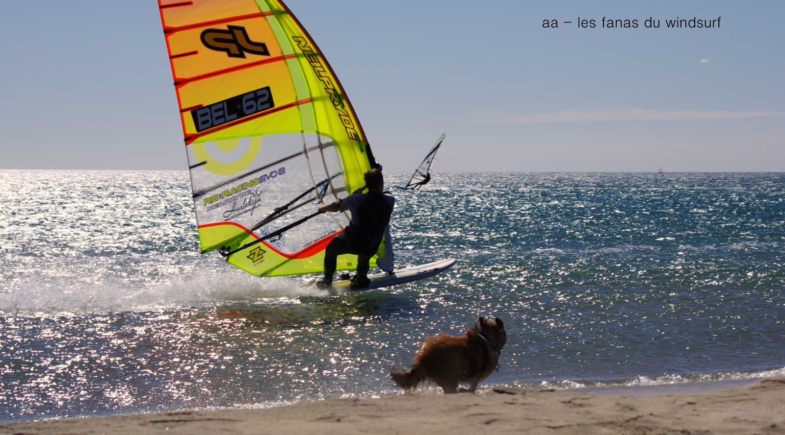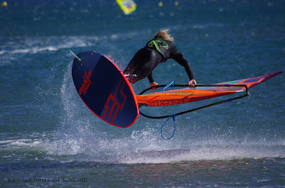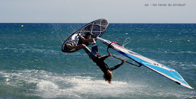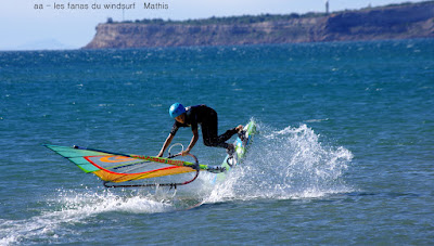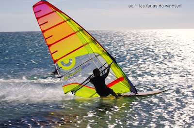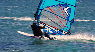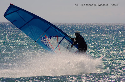 Mardi,Le Rouet de La Palme. Pas mal de matinaux aujourd'hui...il faut dire que les prévisions prévoyaient la chutte du vent à 12h00 en fait il va tenir plus longtemps et je pense qu'il tient encore. Surtoilée en 5.5 pendant une bonne partie de la session je finis sous toilée mais fascinée par la couleur de l'eau et sa transparence, j'arrivais pas à arrêter, c'était magique. A part çà une session typique avec d'un côté des freestylers et de l'autre des speedeux, des pointures dans les deux camps et du beau spectacle. Bonne ambiance mon petit Lucky qui s'éclate encore une super session.