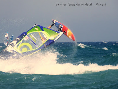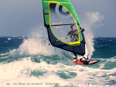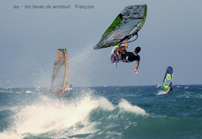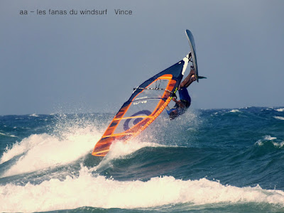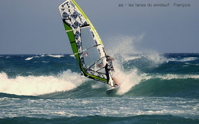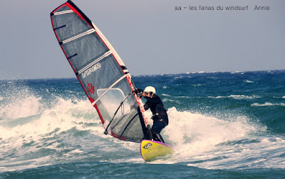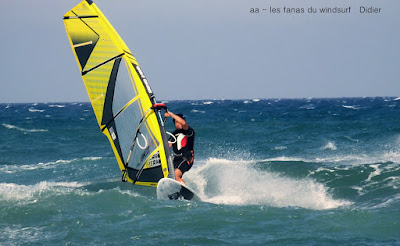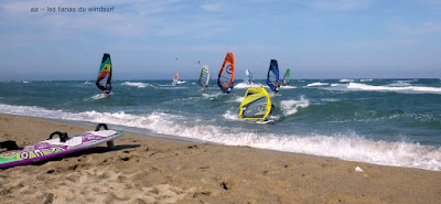 Lundi, St Cyprien. On l'attendait ce marin et on l'a eu, nickel, 4.5 sur 88 litres, au début un peu light mais trés vite çà prend des tours et les vagues se forment. Beaucoup de windsurfers aujourd'hui dans une bonne ambiance. Grand soleil et grosse châleur, l'eau est juste....chaude... profitons en. On peut se vautrer sans souçi ni arrière pensée, vraiment une belle session, demain devrait être encore plus fort.