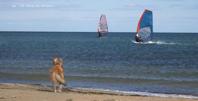 Mercredi, Le Rouët. Encore une belle session même si le vent était irrégulier, comme d'habitude en ce moment. Le plaisir de naviguer avec Erik Beale en prime. Du soleil, plein soleil même un peu éblouissant, du vent entre nord-ouest, ouest et nord, hahaha. Pas trop de monde. Une plage un peu défoncée mais tout à fait praticable et un Lucky heureux et fatigué. Quand à moi je crois que je vais bien dormir l'irrégularité rendant la session in tantinet fatiguante. J'oubliais le magnifique vol de flamands roses au dessus de la mer.