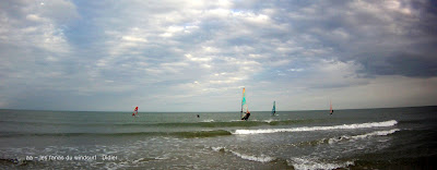 Mercredi, Le Rouët. Christelle me sonne, il y a un peu de vent à La Franqui (merci), ok , on part si vite que je ne prend pas la pile de l'appareil...heureusement nous avons la petite camera genre go pro toujours dans la voiture. A la Franqui c'est mou et surtout il y a un monde de fou, je préfère aller au Rouët où m'attend Didier . Il y a un peu plus de vent, bien ouest, grosses voiles qui vont nous offrir quelques beaux plannings. La petite camera a fait son ouvrage comme si on regardait par le trou de la serrure et ma foi je trouve que çà rend pas si mal que çà.