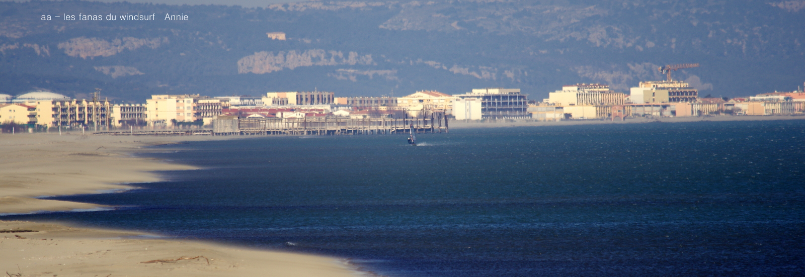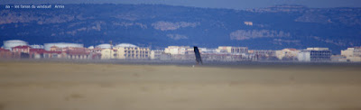 Lundi, La Franqui. Ce matin je suis réveillée par le baston, chouette çà va être pour Couda...ben non en fait le vent tombe, ok on part pour PLN, pas le choix le Rouët étant inondé. Arrivés là bas mauvaise surprise un bull dozer sur la plage encore!!! ben çà commence bien... et puis cet énorme banc de sable ,cette fange en bord de plage, ce sale clapot que je connais trop bien, demi tour. On va à Coudalère le vent est peut être remonté, oui mais vraiment pas génial, la vision de banc d'algues, des copains scotchés sur l'eau dans un vent famèlique et un plan d'eau qui ressemble à rien, demi tour pour La Franqui, au début çà ne me dit pas plus,vent assez nord, fait froid, allez on grée 4.2 et là miracle, à peine sur l'eau je m'aperçois que je peux facilement caper, dans ces cas là il faut se trouver un but pour retrouver l'envie, ce sera le Rouët. Récompense deux énormes trés longs runs qui se méritaient, seule au monde. De retour vers Toutoune je m'aperçois qu'il est posté sur le poste de secours , là Rolan me rejoint et nous voilà repartis pour un bon moment à faire les beaux devant l'objectif. Ca devient compliqué de se régaler mais j'y suis arrivée.