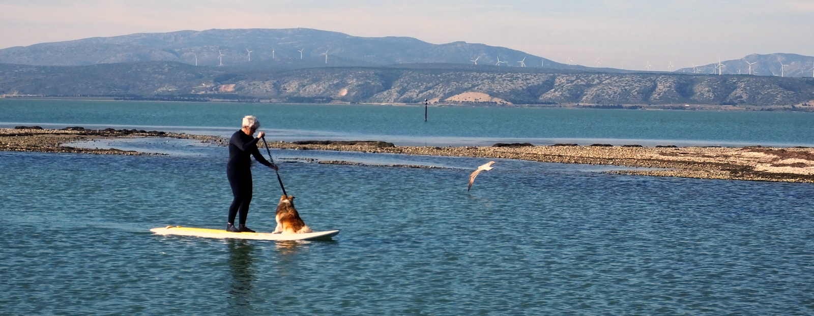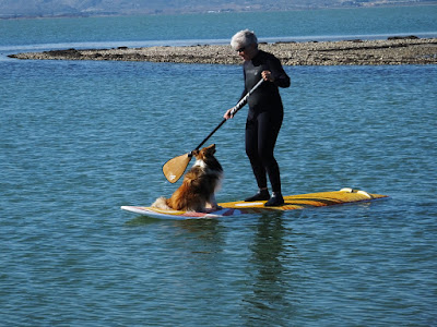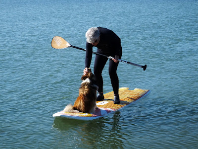 Dimanche, Coudalère. Grand soleil, températures douces c'est le printemps!! Malheureusement pas de vent, ou du moins pas assez. Ca a bien failli le faire à PLN mais cela n'a pas duré, çà pourrait le faire au Racou mais pour l'instant rien à signaler, hé oui le vent fait le yoyo entre sud et nord ouest alors nous sommes restés à Couda, en sup, longue promenade en solitaire et puis petite promenade avec Lucky . Je sais çà ne pourra intéresser que ceux qui suivent ses aventures mais moi çà me fait plaisir. Le vent revient mardi...tenons bon.
