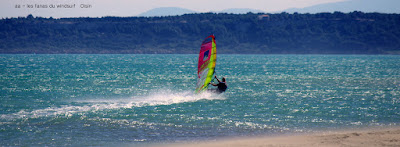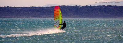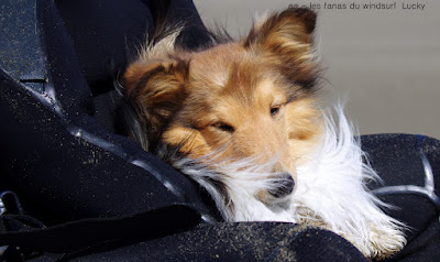Mardi , Le Rouët. Ce matin une furieuse envie de changement, même si le Rouët est vraiment difficile d'accés nous partons sans regret. Bon le mauvais moment à passer c'est rouler dans la flotte... pas bon, et encore pire au retour, à karcheriser d'office. Mais après c'est toujours le même fantastique spectacle alliant la beauté du paysage, la couleur de l'eau et la force du vent. Pour la force de vent on s'attendait pas à un tel déluge, j'ai fini complétement à la rue et fourbue. Mais le plus fourbu fût certainement notre petit Lucky qui a suivi obstinement les grands du speed, Jacques Van Der Hout, Hans Kreisel, Oisin van Gelderen et les autres, çà fait des kilomêtres, on attend les résultats aussi bien sur la mer que sur le canal.