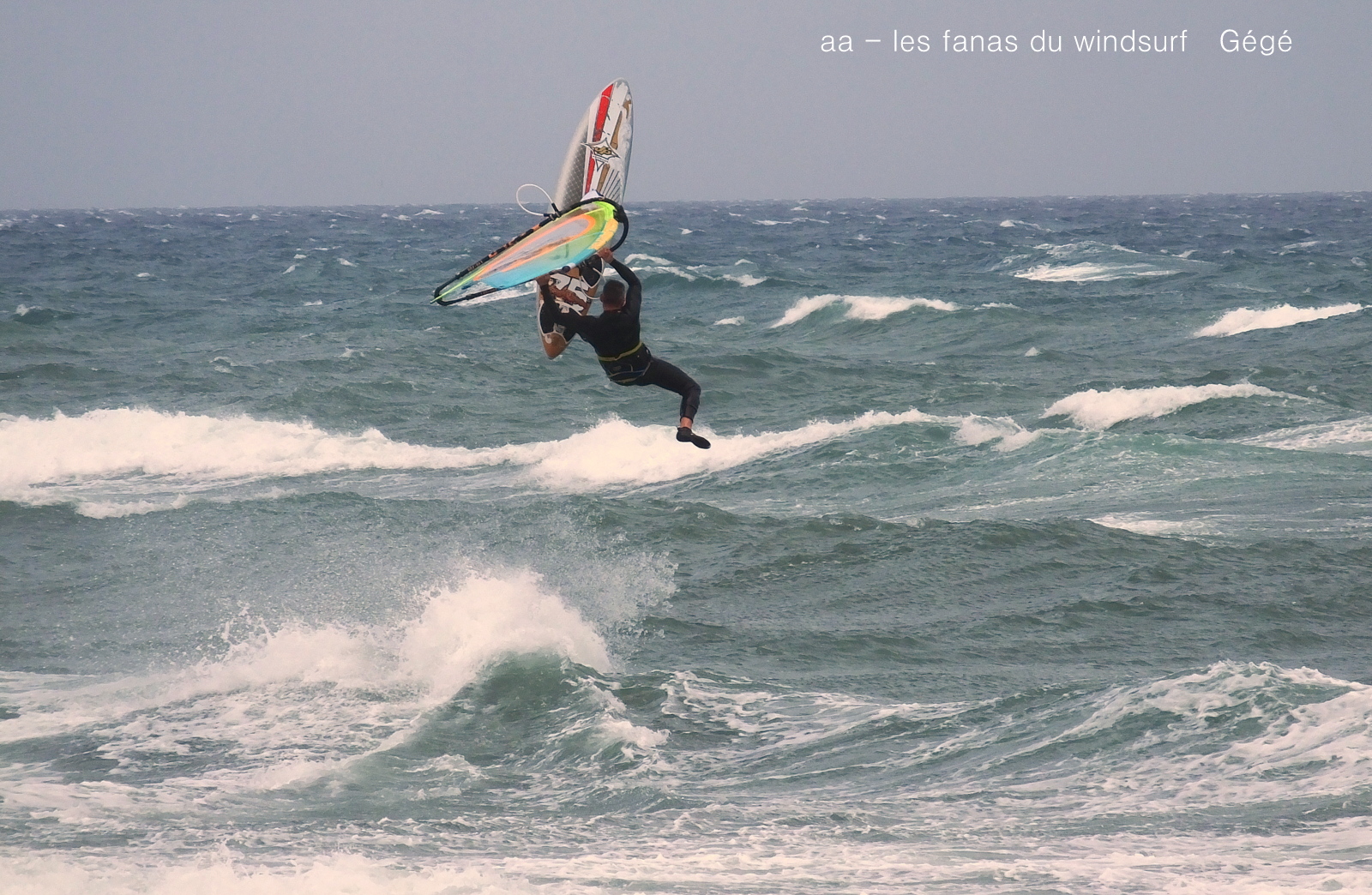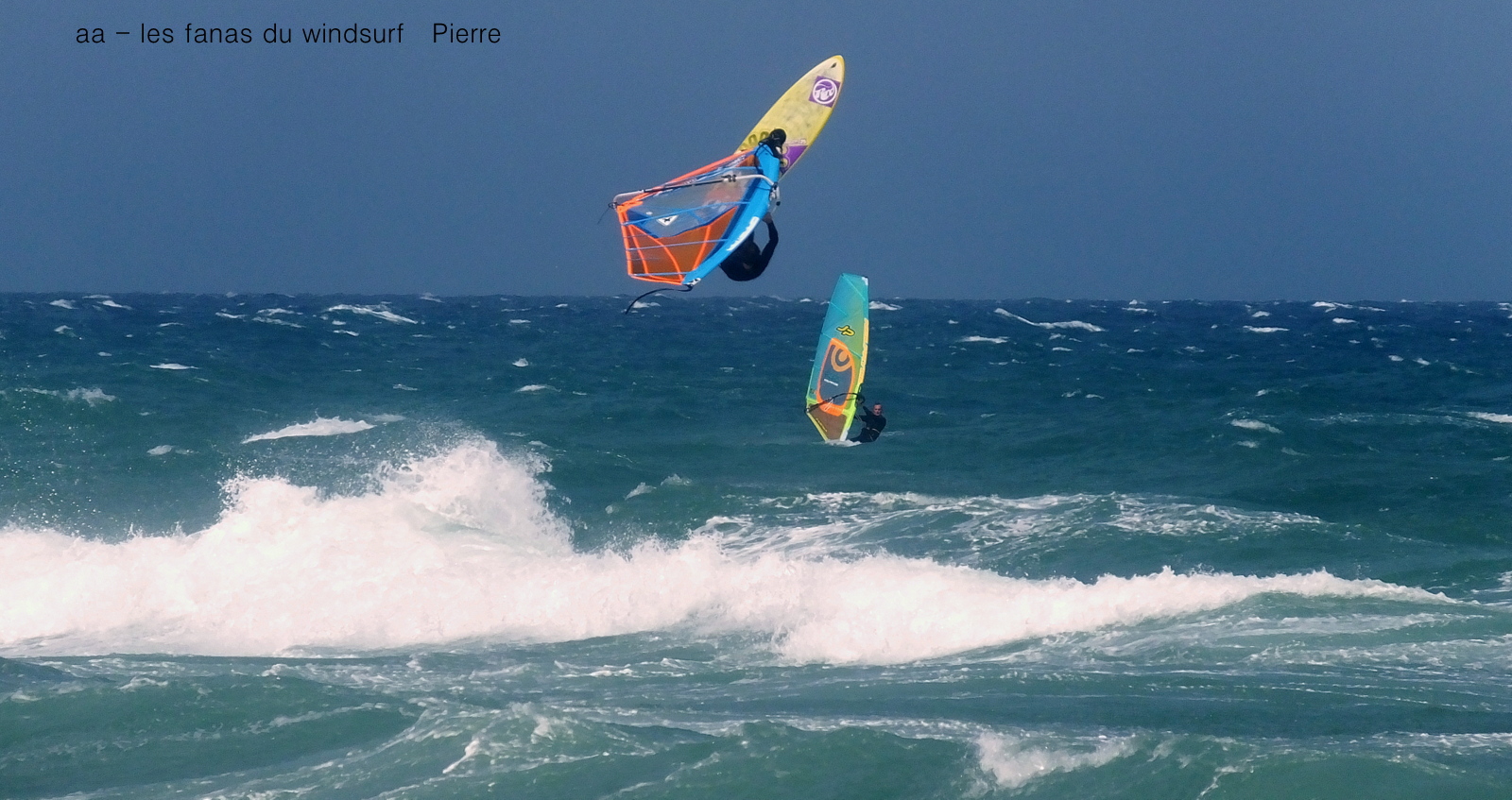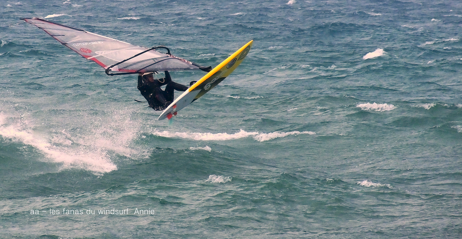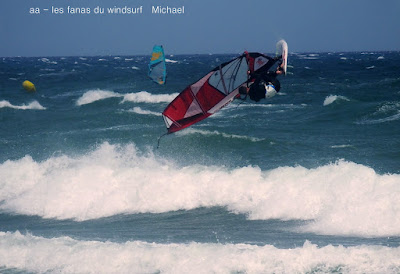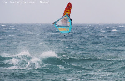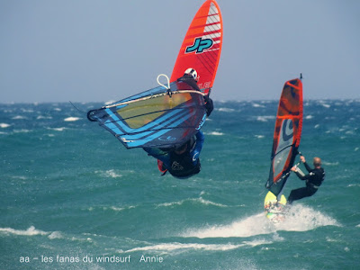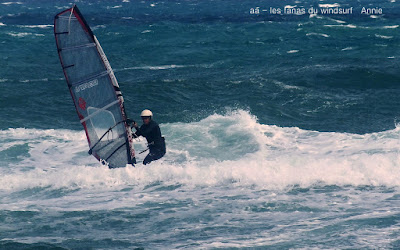 Mercredi, St Cyprien. C'est pas souvent qu'on a un marin aussi fort, et toute la journée en plus. Du coup j'étais un tantinet surtoilée avec ma 4ms(j'avais pas pris plus petit) quand on pense que René avait 3.9 lol. Prés de 40 noeuds dans les rafales, du soleil mais frais. Assez peu de monde et quasi pas de kite. D'abord assez sud avec de belles grosses vagues il va tourner plus onshore et le vent fort va un peu rabaisser les vagues. Elles étaient assez belles pour que certains s'envoient en l'air, petite mention désolée pour Gégé qui au bout de 2 bords a explosé sa planche alors qu'il s'éclatait (un peu trop peut être...) Voilà, une superbe session, un coude en vrille et de magnifiques images dans la tête, merci Toutoune pour les photos, j'ai essayé pendant 1/4 d'heure c'était abominable, du sable partout un appareil qui n'arrêtait pas de bouger, châpeau.