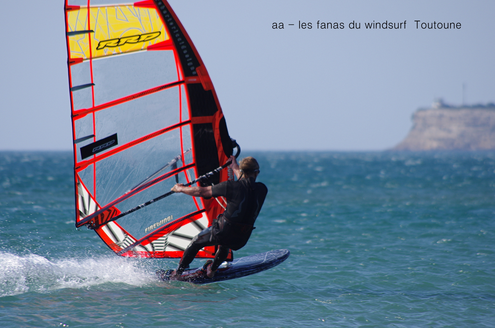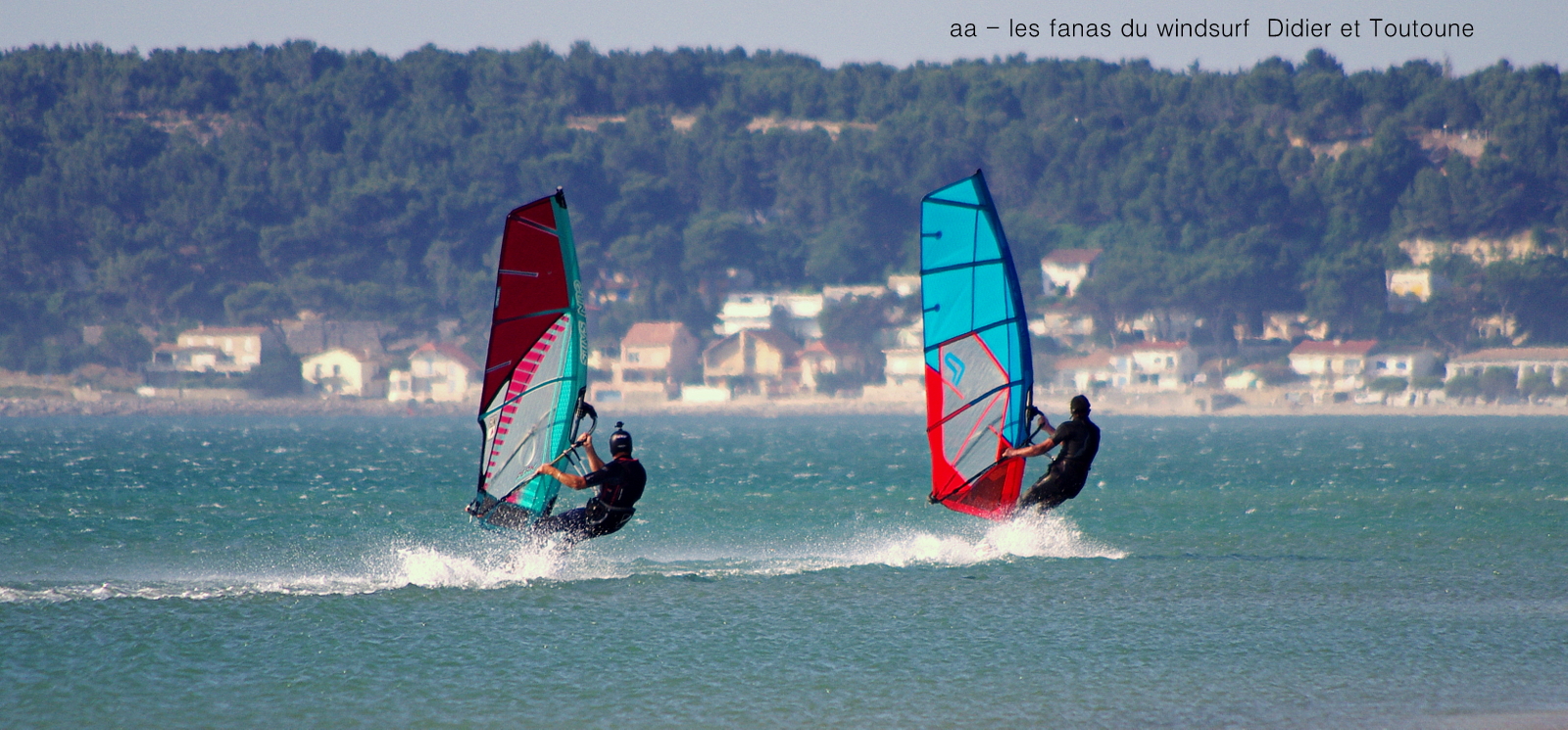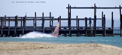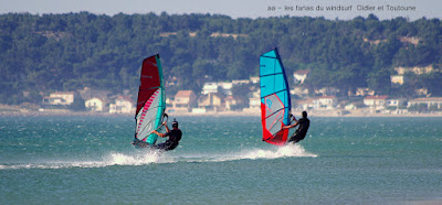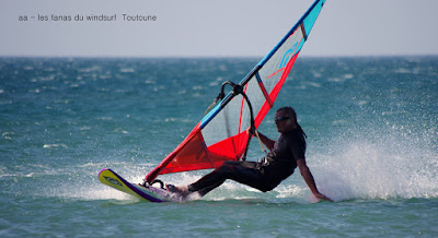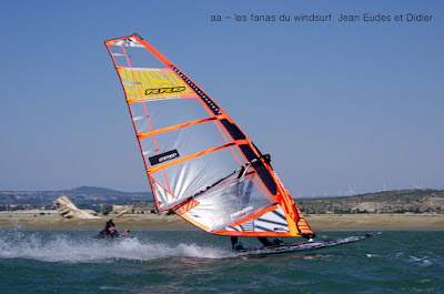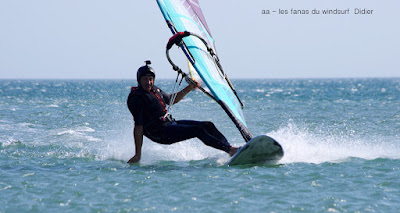 Lundi, Le Rouët de LaPalme. On l'avait repéré ce petit coup matinale qui allait nous laver de cette pétole poisseuse!!! en fait de petit coup à 8h00 sur l'eau avec un gros 40 noeuds en 4.7!!! et oui j'avais pas pris plus petit. En fait je me suis éclatée, à fond sans se poser de questions, et puis les copains arrivent, et mon Toutoune en plus, et Lucky qui s'éclate à l'abri de ses lunettes. Super ambiance, le vent va tenir plus longtemps que prévu et je dois dire que là je suis rincée et calmée, que çà fait du bien!!
