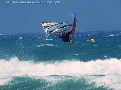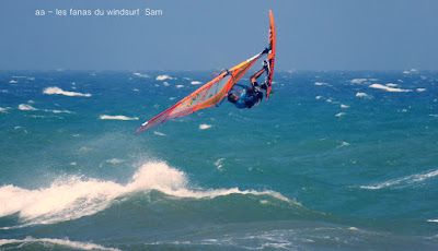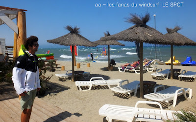 Lundi, St Cyprien . La journée devait être grandiose mais quand çà veut pas çà veut pas...Déjà le matin imprimante en rade bon c'est que du matos, 11h30 on passe à l'Agly, l'eau est brune, l'Agly touche la mer (mauvais souvenir), les conditions sont pas trés belles, une bonne vingtaine de noeuds trés onshore. Je décide d'aller voir à St Cyprien, bon la pelouse c'est fini il faut aller à Cypriano,la mer est d'un bleu splendide, le vent souffle fort, même trés fort et je n'ai pas pris ma 4ms!! bon çà sera 4.2 à la rue avec cependant des molles de temps en temps, du shorebreack, des conditions hards avec un plan d'eau trés dur. Ce qui devait arriver arriva, catapulte, pouce retourné, fin de l'histoire, le mieux c'est de rentrer mettre de la glace . En arrivant au rond point de St Marie on décide d'y aller voir. Les conditions sont nettement plus soft et le vent beaucoup moins fort, on en profite pour prendre quelques photos du club de plage "Le SPOT" de Kevin et Mathieu,ils le méritent bien grâce à eux on peut naviguer à St Marie en été!! bien sympa, en plus on me soigne avec une bombe glaçiale comme un rugbyman,Mitch est là aussi les abdos déchirés,décidemment.....2- 3 photos de Sam.Allez c'est une mauvaise passe, si tout va bien demain devrait être mieux si j'y arrive.