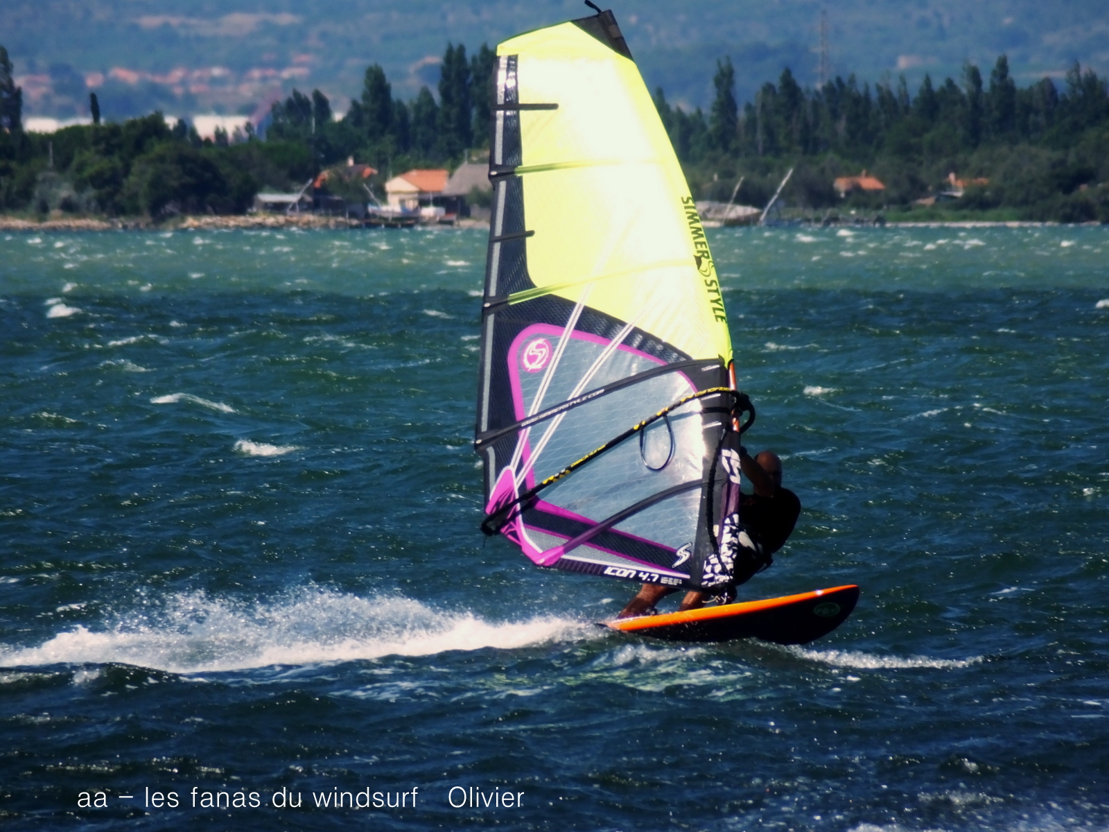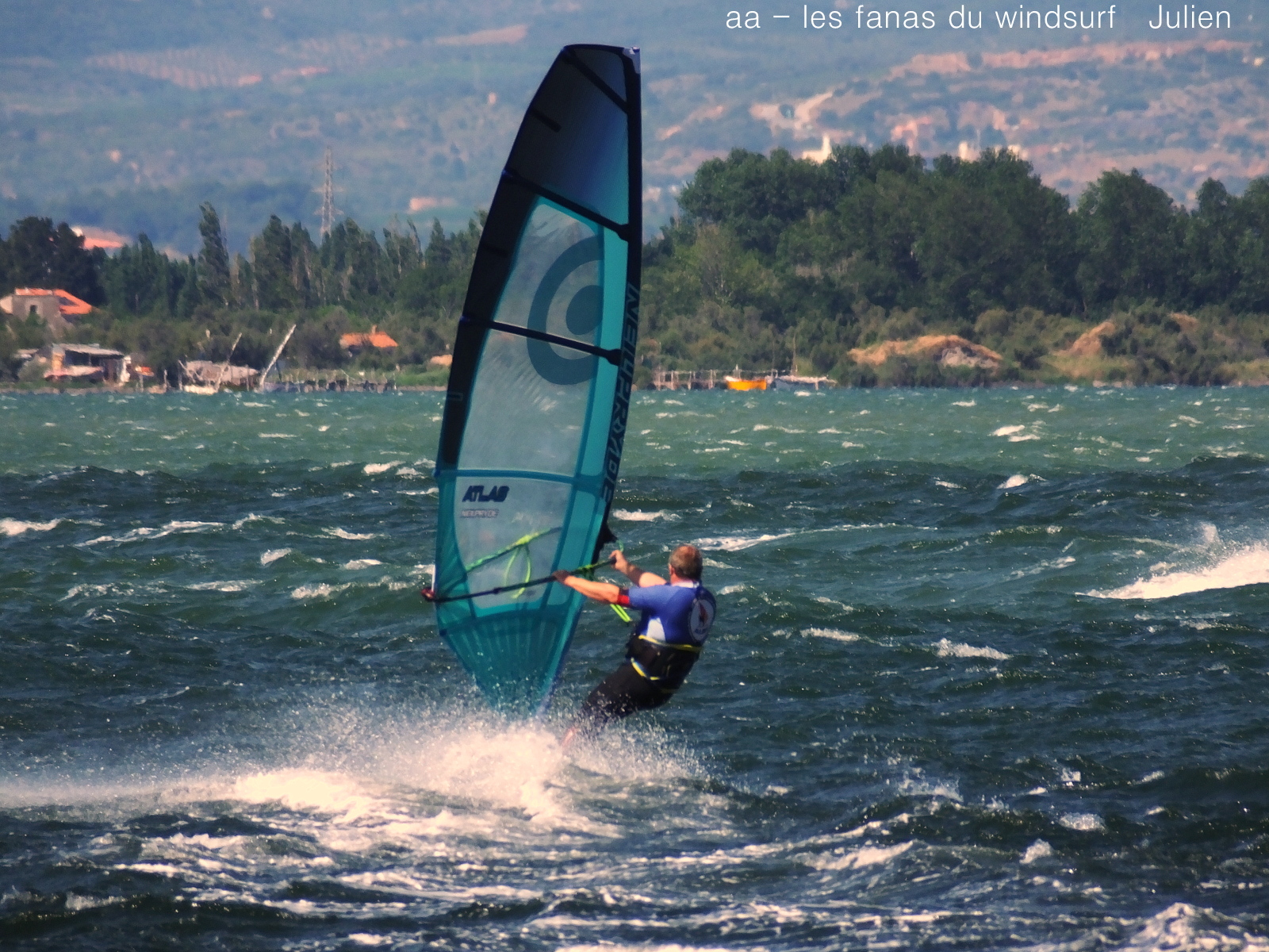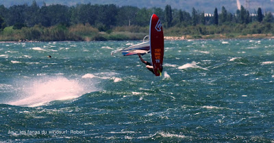 Vendredi 14 juillet, Coudalère. Pour nous ce matin il était évident que la session se passerait à la maison. C'était un gros pari, pari gagné car même si au début c'était un peu light trés vite le vent prend des tours me forçant à changer de voile. Par contre vent assez nord comme d'habitude et donc plan d'eau clapoteux d'autant plus qu'il y a du monde. Une belle session, je me suis régalée.