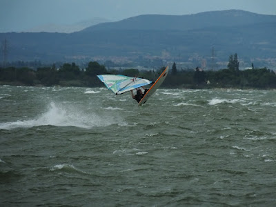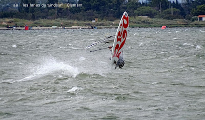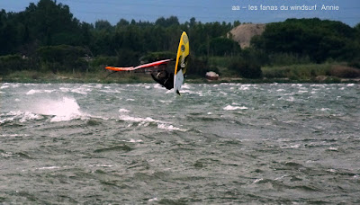 Mardi, Coudalère. Le vent souffle trés fort ce matin, du coup on se presse et j'oublie la carte mémoire. Heureusement il avait une petite mémoire (de mauvaise qualité) dans l'appareil, pour le reste merci à Clem de nous avoir prêter la sienne. Le début fût parfait augurant d'une belle grande session en 3.7, mais le gros vent ne va durer qu'une heure vingt avant de s'étaler comme une bouse trop fraîche...... déception, en plus il fait pas chaud, beaucoup renoncent, j'insiste puis j'attends à 14h00 je renonce aussi il aurait fallu changer de voile et après les impressions du matin ce n'était plus que du gâchis. Je vais pouvoir me reposer la canicule m'a tué et j'ai le dos en compote.