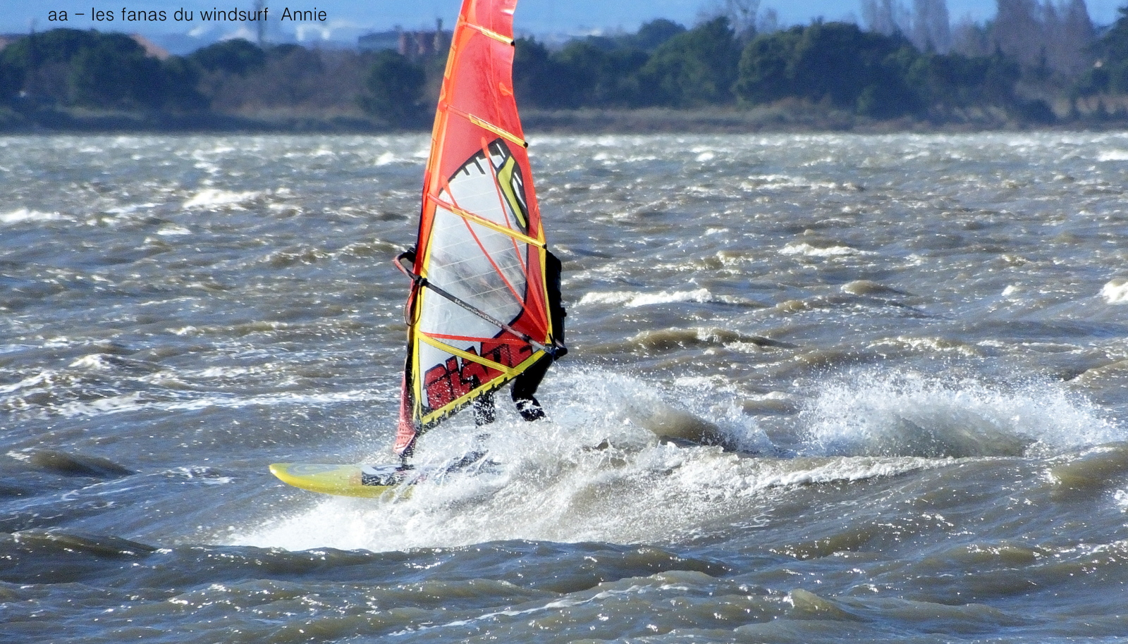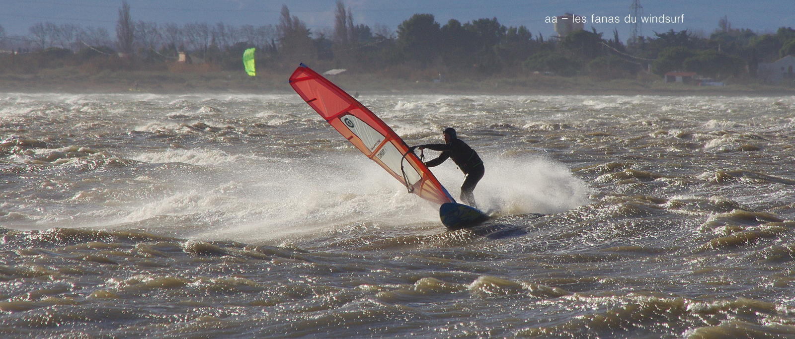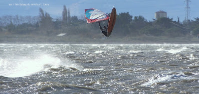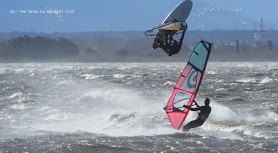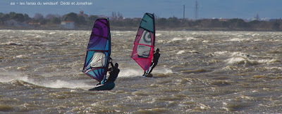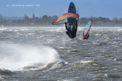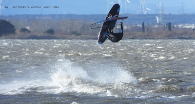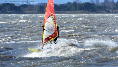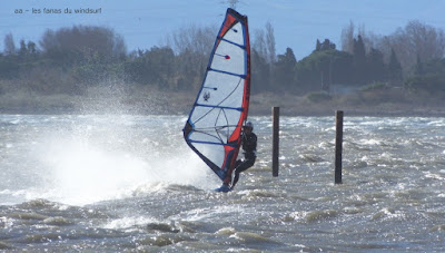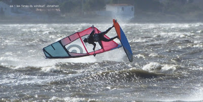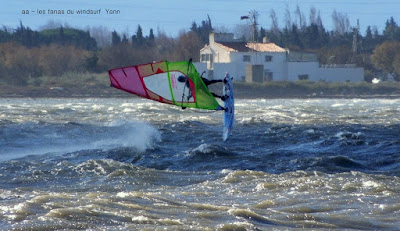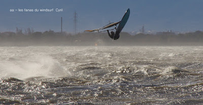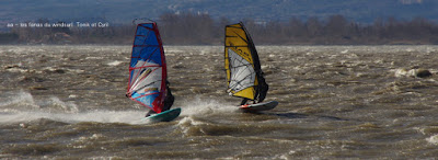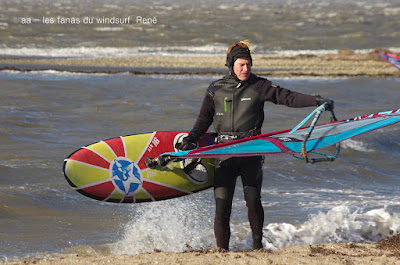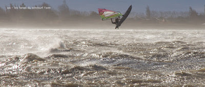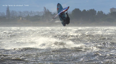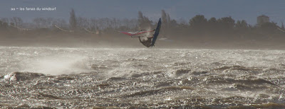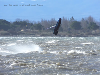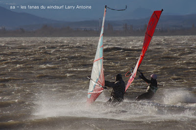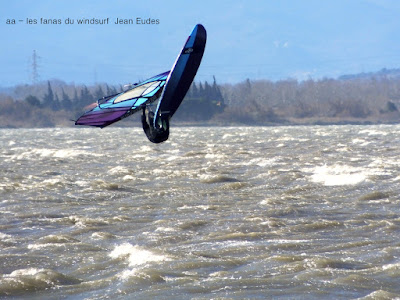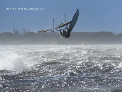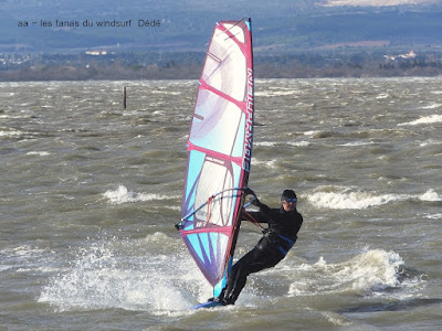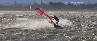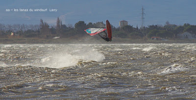 Jeudi, Coudalère. Au début rien on a bien cru à un nouveau fiasco, puis ça commence d'abord doucement et irrégulier, puis fort et irrégulier, puis trés fort, puis passé 50 noeuds, tout çà en un aprés midi! on ne s'y attendait pas mais on l'a pris en pleine tête , heureusement il ne faisait pas trop froid même sil'eau n'était vraiment pas chaude, demain je grée direct 3.3!