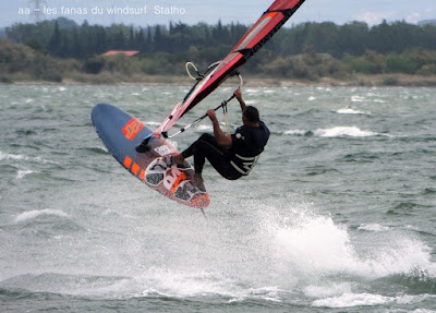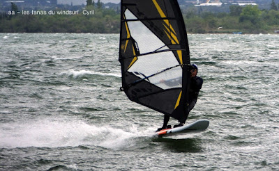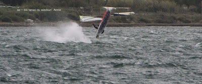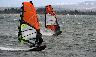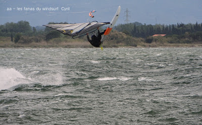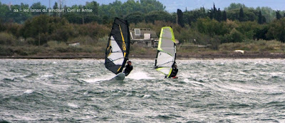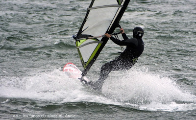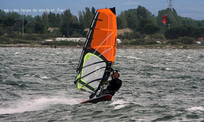 Lundi, Coudalère. Honnêtement j'avais décidé d'aller au Rouet oui mais voilà, aprés le sud le vent est passé nord ouest voir nord trés fort, un plan d'eau démonté, les vagues s'affaissent mais le clapot non. Bon je vais gréer 4 mêtre.... ben non je l'ai pas,!!! le vent prend encore des tours. Aller je décide de tenter ma chance à Couda, en arrivant le vent est là, il va être trés irrégulier, je suis en 4.2 uisque je ne suis pas passée par la maison, au moins j'ai pu essayer ma planche et ça c'est top!