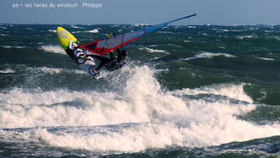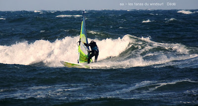 Vendredi, Barcarés. Encore une fois le marin va avoir du mal à passer sur le sud, on attend pendant 3 heures à St Cyprien pour le bonheur de Lucky mais il faut se résoudre à repartir vers le nord direction Barcarés. Bonne décision, le vent est là pour 4.7, un peu juste au début, je fais l'erreur de prendre ma grosse planche mais çà va passer jusqu'au bout malgrés le clapot toujours présent. Belles vagues, le vent va se renforcer, tout le monde est là pour en profiter. Cà fait du bien d'avoir du marin après toutes ces sessions de tram, en plus avec le soleil. Un petit mot pour Toutoune qui a fait ces belles photos, caché dans les rochers alors qu'il n'est pas en grande forme.