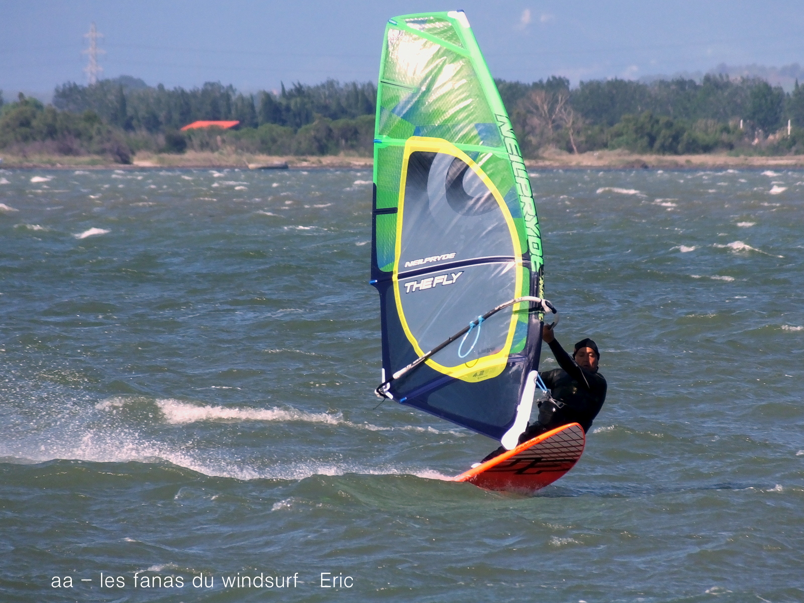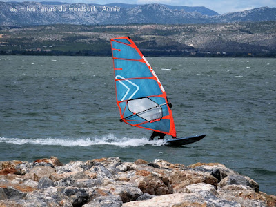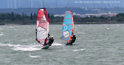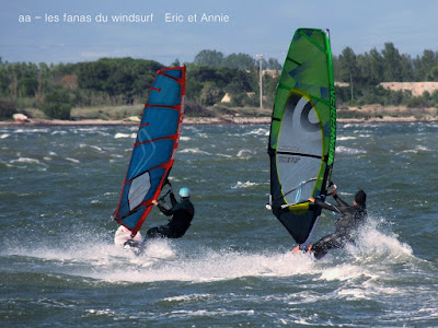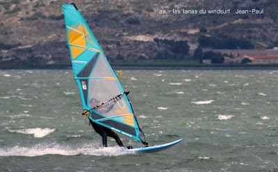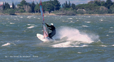 Mardi,Coudalère. Toujours pas envie d'aller vers le nord.... là je prends un risque puisque la météo n'est pas trés optimiste. Aussi départ trés tôt et sur l'eau à 9h15, Eric lui y était déjà depuis 8h30 . Nous allons profiter de belles conditions jusque 11h30, en 4.2 et 76 pour moi. Là le vent se met à tomber...que faire?? pas envie de démanger, Toutoune va chercher ma 111 et je change pour 4.7, et c'est reparti pour un tour jusqu'à 14h00 , en effet le vent après une petite mollesse est reparti lui aussi, ben je me suis régalée et je ne regrette pas d'avoir fait ce choix, demain rien et jeudi tram mais cette fois ci il faudra aller dans le 11....