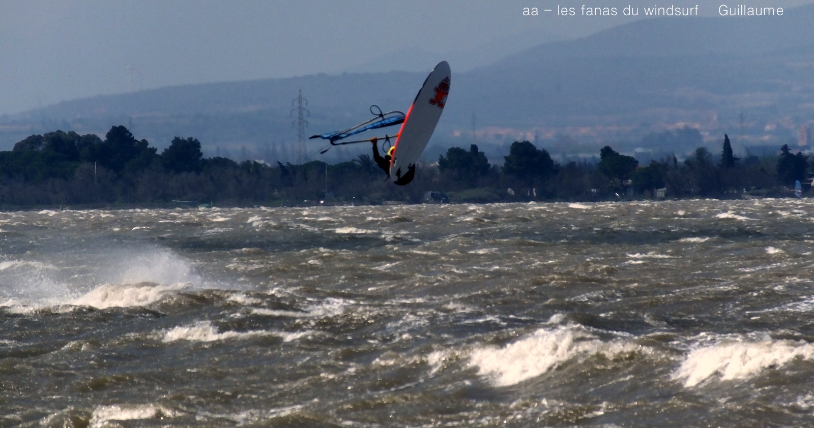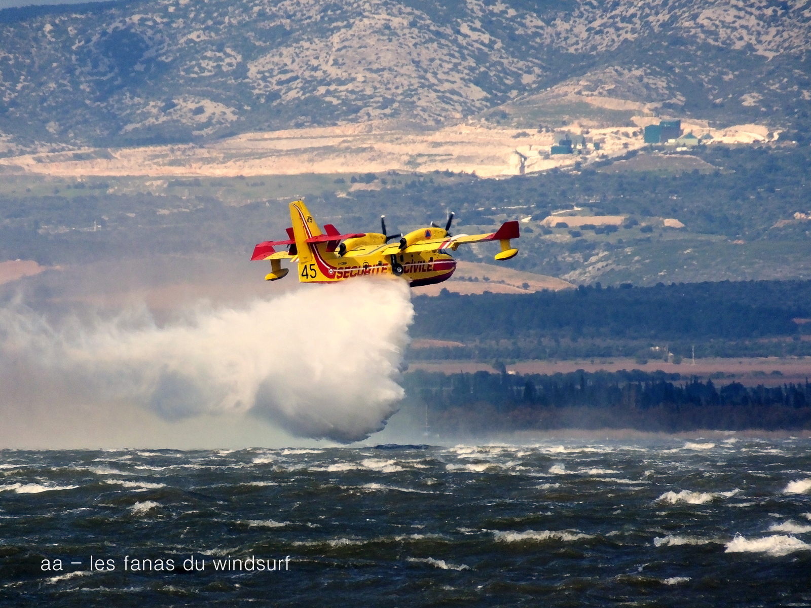 Vendredi, Coudalère. Un peu de tout aujourd'hui, en effet à notre arrivée nous avons eu un spectacle magnifique avec les canadaires à l'entrainement, le Canigou derrière c'était superbe. Tôt ce matin le vent était bien établi pour 3.7, mais toujours assez nord et donc irrégulier. On se faisait la réflexion avec Guillaume qu'en ce moment les vagues sont aplaties plus du tout celles que nous avions il y a deux ans, certainement la direction du vent et l'ensablement du spot, il y a pied à plein d'endroits. Enfin bon, nous voilà donc à Couda pour une session froide, physique car irrégulier, mais du vent fort comme on l'aime. Vers 13h30 le vent commence à baisse et surtout les molles sont d plus en plus présentes. 14h30 après avoir galéré dans le retour je décide de m'arrêter, j'en ai assez et les autres prendrons le relais.