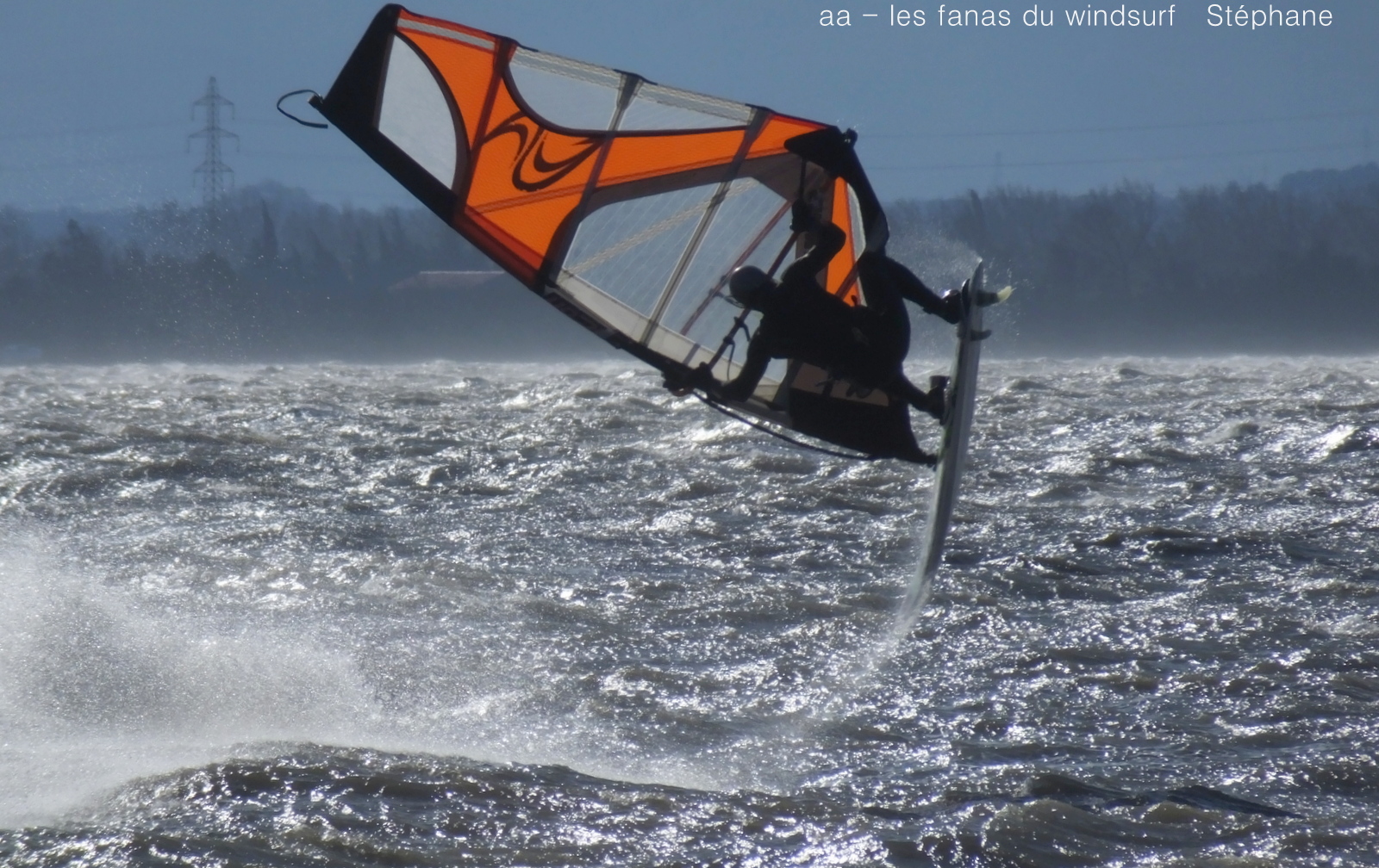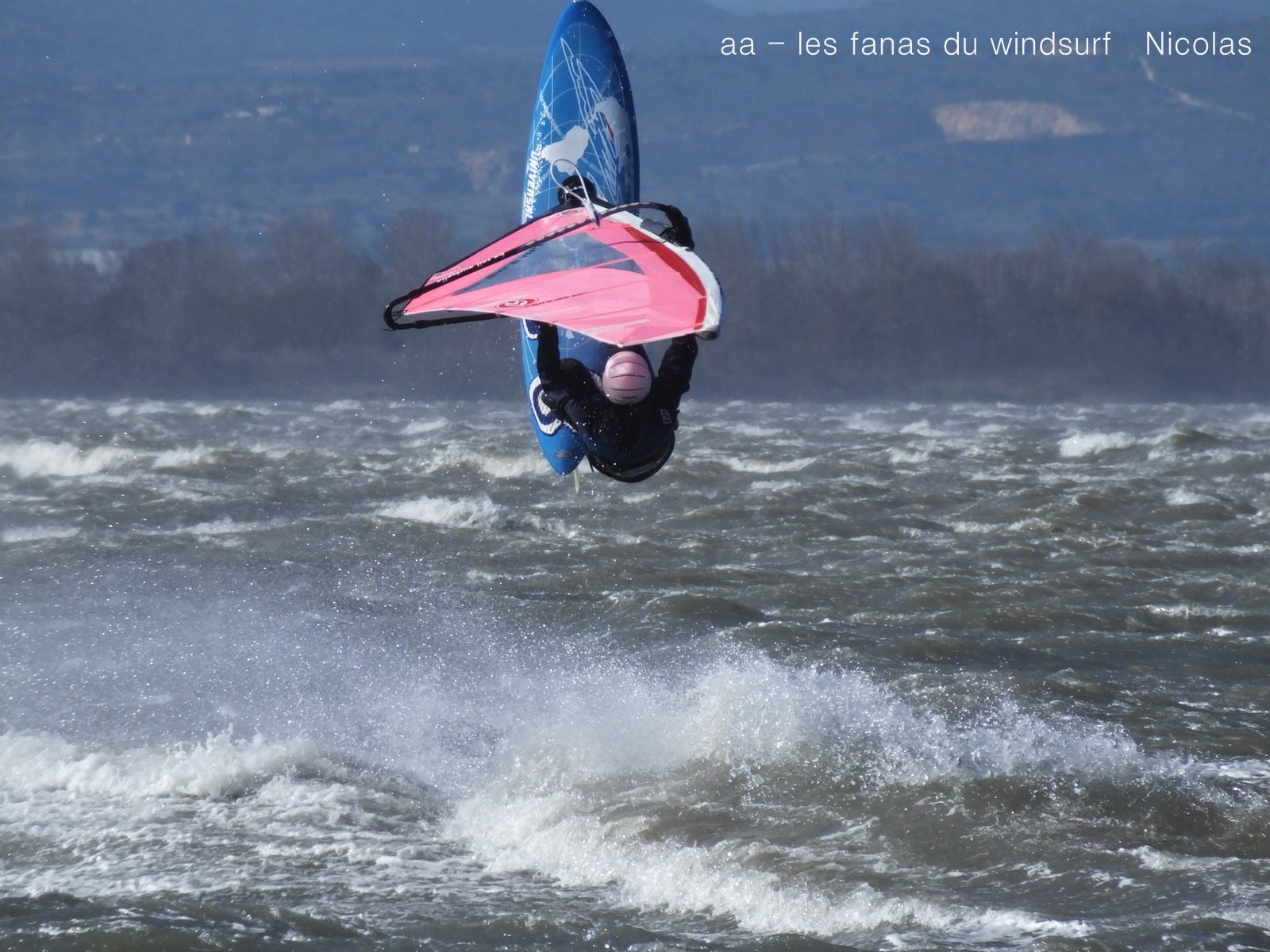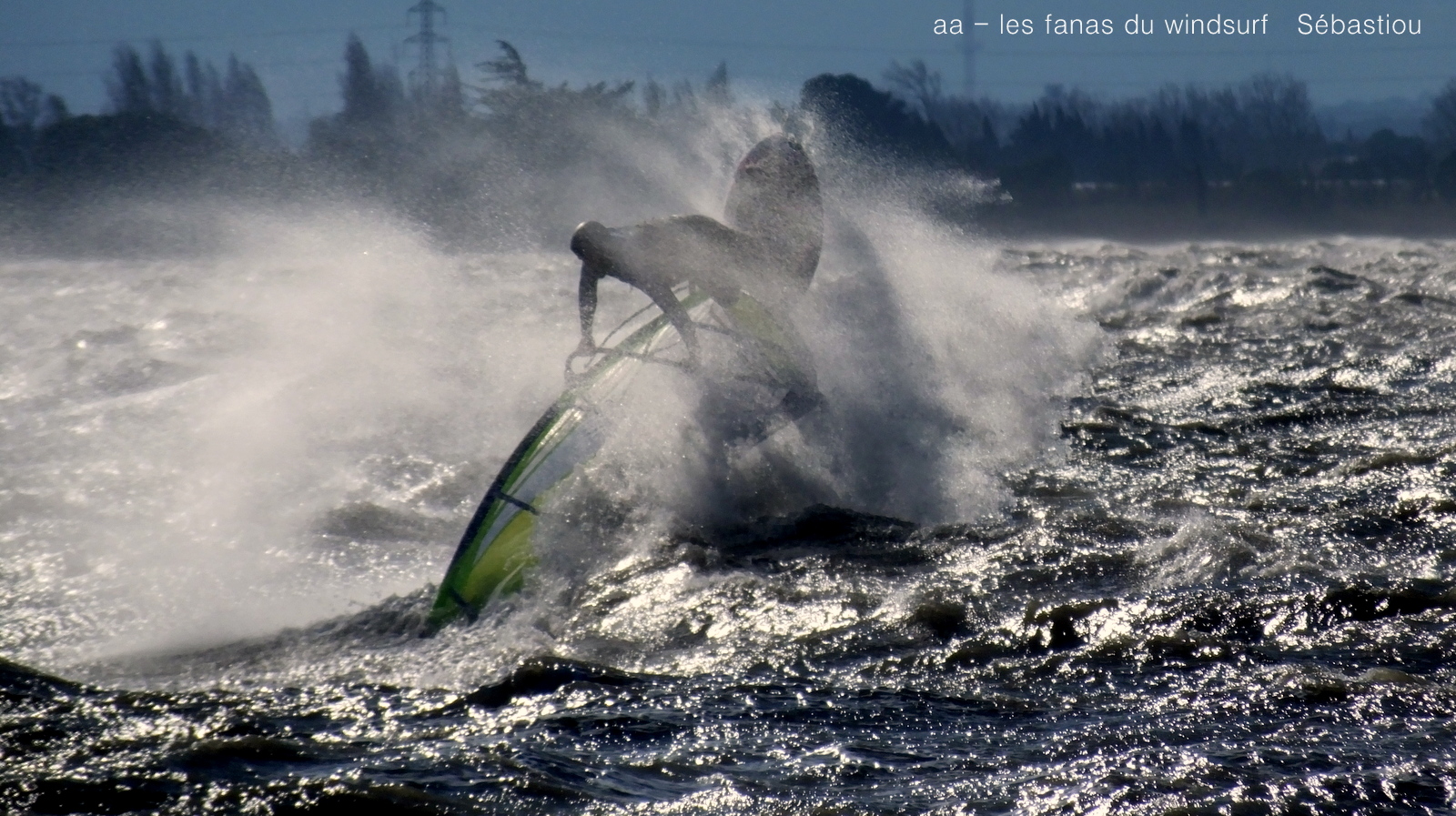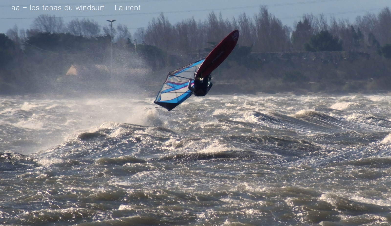 Lundi,Coudalère. Du gros de chez gros vous en voulez et bien en voilà. Tout ou rien, cela faisais longtemps qu'on avait pas eu des conditions aussi grosses et toute la journée comme en témoignent les 2 prises anémos. Le froid en plus, on peu dire froid, un choc thermique. Ombre au tableau vent un peu trop nord plan d'eau clapoteux par moments mais grosses vagues quand même. Arrivée tôt le matin je commence seule sous l'oeil contrarié de Toutoune, 3.5 et 68 litres, je suis vite rejointe par Laurent en 3.4 et Nicolas en 2.9, pas de temps mort.Puis les autres arrivent le vent ne baisse pas, d'énormes claques blanchissent le plan d'eau mais maintenant le soleil fait face à l'appareil un enfer pour le photographe, mais quel beau spectacle!!!