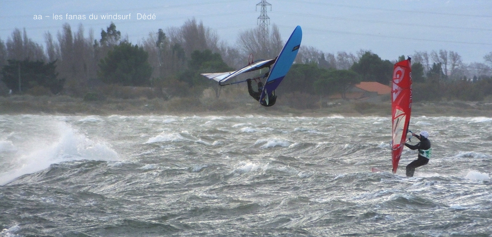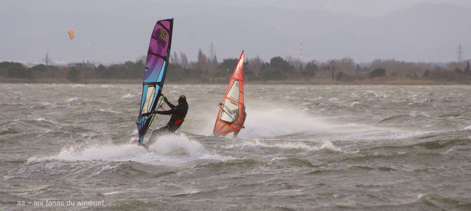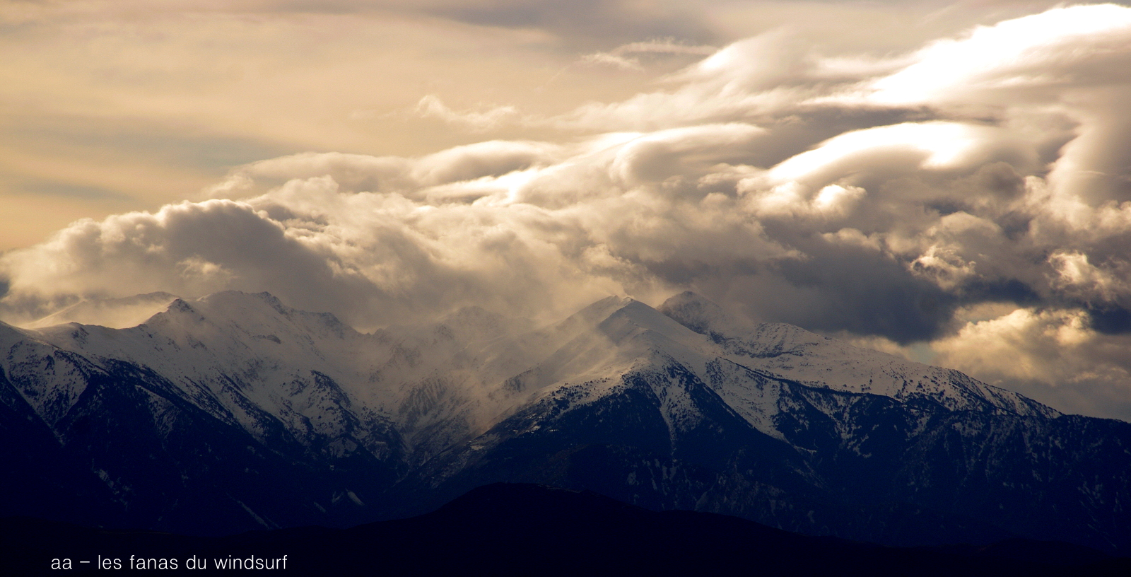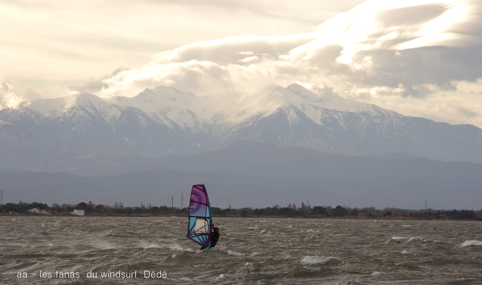 Mardi, Coudalère. Un froid de canard pas plus de7°! le ciel est noir le plan d'eau aussi, le vent est fort mais irréguiler. Pas beaucoup de monde (on se demande pourquoi), par contre un Canigou plus beau que jamais dans la tourmente. 3.3 pour moi mais pas assez de volume pour passer les déventes. Espérons que demain il fasse beau.