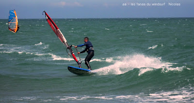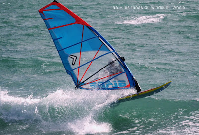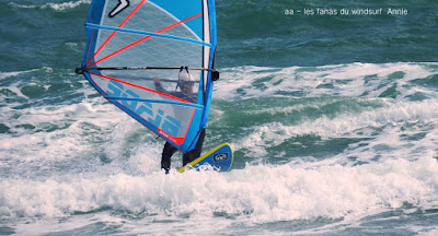 Lundi,St Cyprien. Ce matin un peu en vrille avec le changement d'heure je suis comme une vieille chaussette devant mon ordi quand Jean Paul me tire de ma torpeur : "Annie il y a du vent à St Cyp!!!" comme Lazare je sort de ma tombe direction le bonheur surtout que la météo annonçait du soleil le matin et gris l'après midi ce qui arriva. 10h00 du mat (9h00 quoi), 20 noeuds, de sud-sud-est, grand soleil mais un peu frais, c'est parti pour 2.30heures en solo dans des conditions parfaites, merci Jean Paul!!. Vers 13h00 le vent faiblit un peu et passe à l'est, entre temps sont arrivés Nicolas et Michael, puis Jean Paul et René. Notre René enfin de retour sur l'eau et visiblement heureux d'être là. Les nuages s'épaississent . 15h00 je ferme le banc;