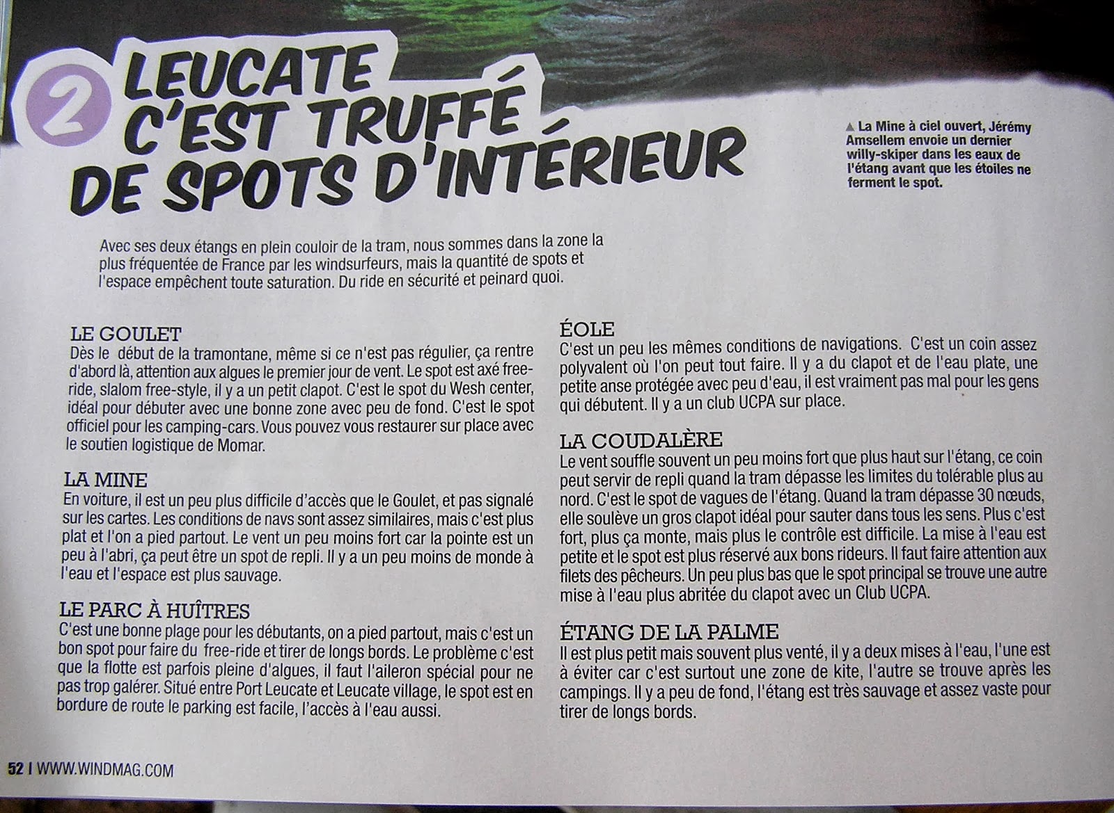 Je vous en avais parlé au moment de sa visite, Jean Souville était venu faire quelques shootings pour un article dans Wind sur Leucate, 7 pages dédiées à notre terrain de jeu favori, avec des superbes photos et des articles écrits par Jean et accessoirement Jérémy pour Coudalère et moi pour la page sur les fanas. On y parle de tous nos spots y compris Eole et Coudalère (avec la photo de Jérémy le jour de la grosse tempête). On y parle aussi de notre Wesh et de sa pépinière de petits windsurfers et bien sûr de bien d'autres endroits. Merci à Jean pour ce coup de projecteur et pour sa gentillesse! en espérant qu'un de ces jours il vienne faire un tour à PLN!!! Merci à Dédé du coup de fil! j'attendais gentiment que cela paraisse sur FB! je pense que cela fera plaisir à tous ceux qui aiment notre région!! et cela fera un beau souvenir!