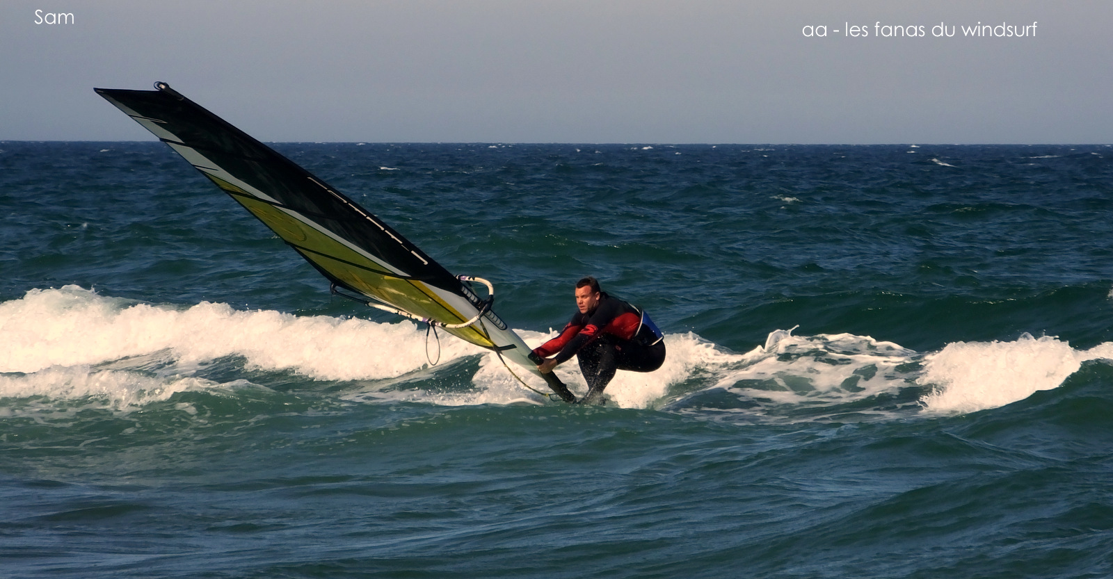 Vendredi, St Cyprien. la carotte de l'année!! et oui on y croyait à notre coup de marin! pas thermique non marin. Ils l'avaient annonçé depuis plusieurs jours!! aussi quand nous avons vu arriver la barre on a tous grée boards de vague et 5.2 - 5.4 . Tout le monde court à l'eau mais ce n'était qu'un leurre, un vent inconsistant, rien. J'aurais pu gréer 6.2 sur ma 111 planning assuré, mais nous étions là pour faire de la vague! pour finir le seul qui va s'en sortir sera notre Sam sur sa Sealion...normal....