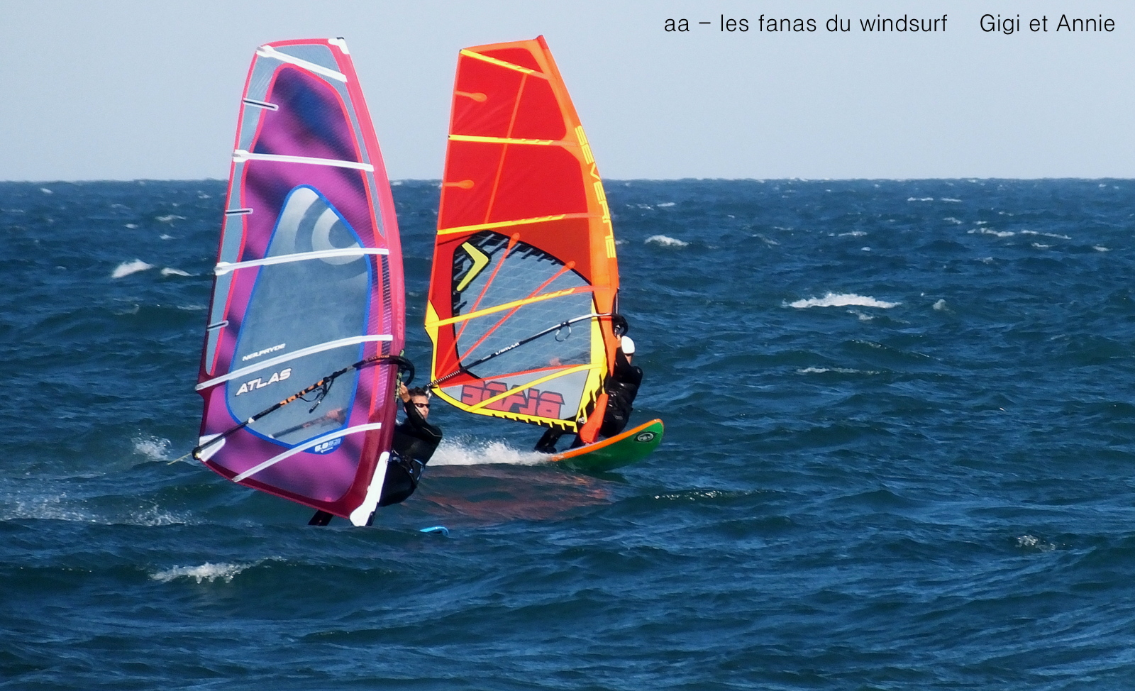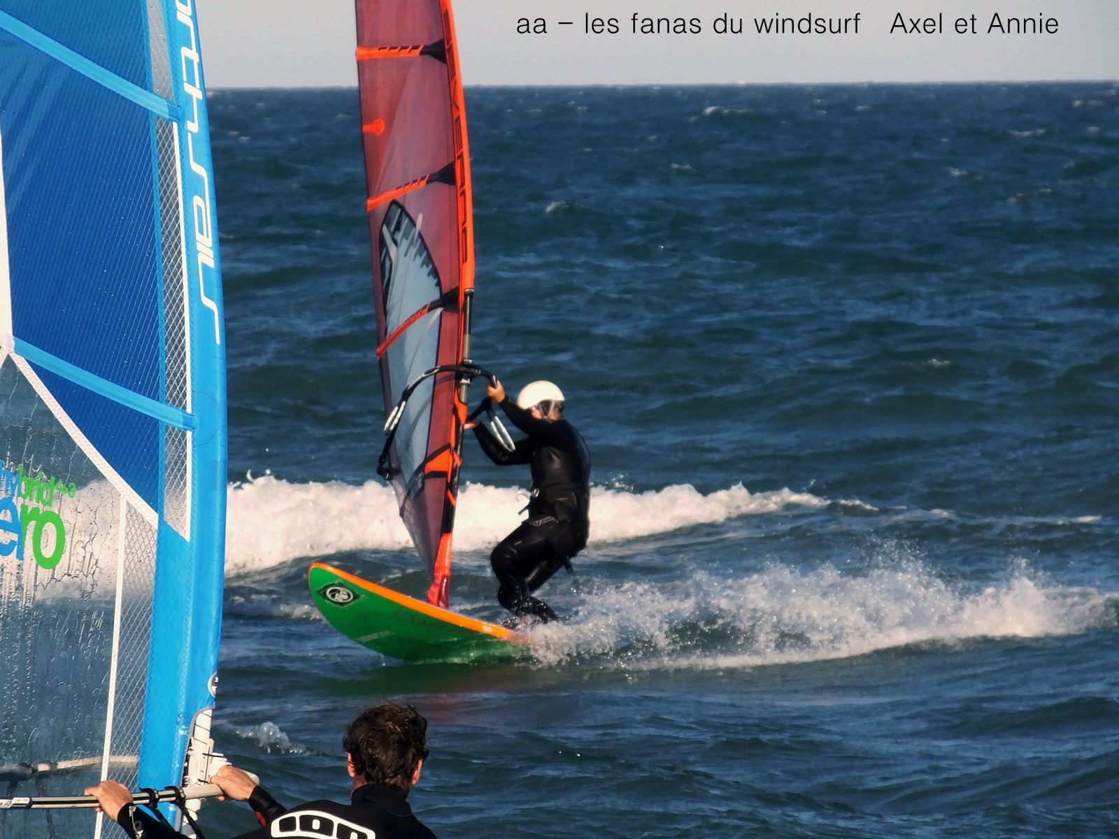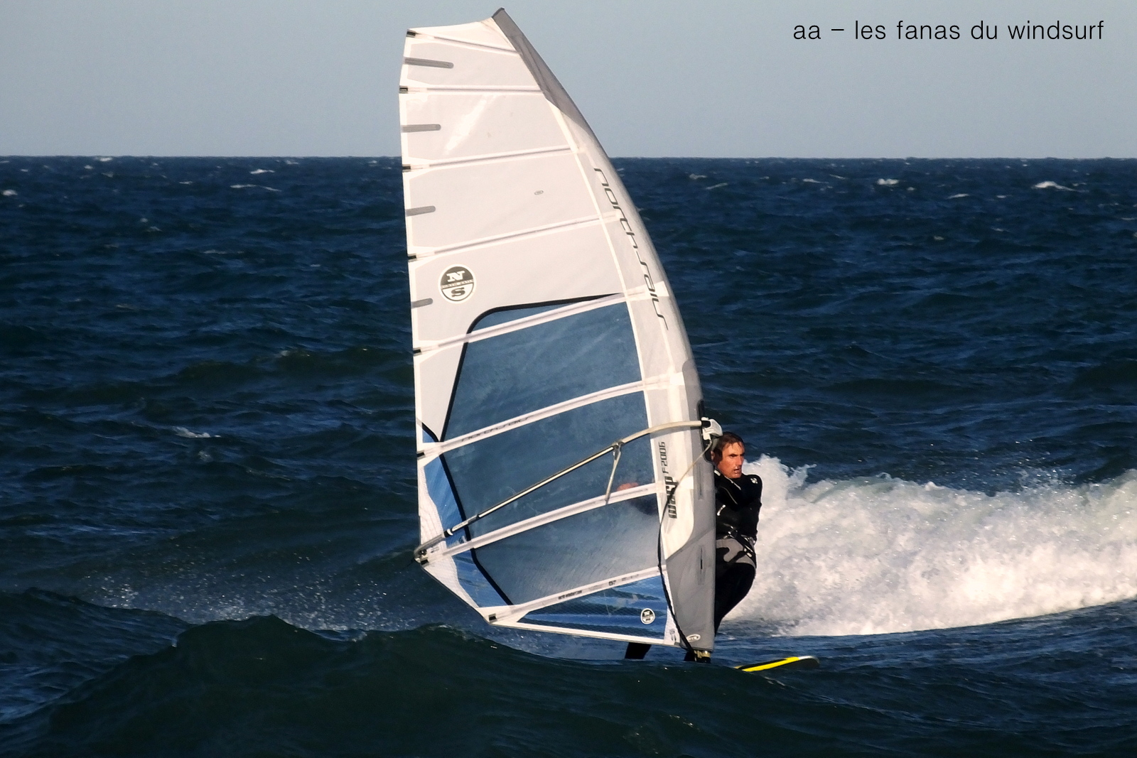 Vendredi, St Cyprien. Petit marin annoncé, à notre arrivée c'est light 12-14 noeuds, çà monte un peu, Christophe nous téléphone d'Argeles c'est bon pour 4.7 (merci), mais j'ai déjà gréé 5.7 je reste, et je sais qu'avec un peu de patience le vent va arriver à St Cyp. En effet au bout de 3/4 d'heure je grée 4.7, un peu juste de temps en temps, pas mal de clapot, mais un soleil de fou et la douceur. Une belle petite session.