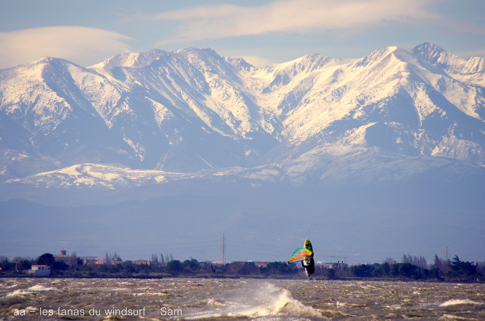Mardi,Coudalère. Pffffff....la magie s'est envolée, la tramontane nous a laissé un vent du nord irrégulier, quel dommage...du vent il y en a eu puisque perso j'ai navigué en 3.5, mais aussi en 4, un coup y en a un coup t'es à la rue, enfin bon du coup le plan d'eau a du mal à se former et comme le vent n'a pas la bonne direction bien difficile d'envoyer du lourd comme hier, même pour les meilleurs. Et pourtant nous étions sous le regard et la protection d'un Canigou plus beau et majestueux que jamais.