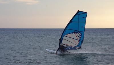 Lundi, Le Rouet. Quel dommage, la session avait si bien commençé . 7h30, 5.5, le ciel est menaçant avec à l'arrière plan les couleurs encore présentent du lever de soleil, magique. Le plan d'eau est lisse et je suis seule, le bonheur avec Lucky sur la plage qui m'accompagne. Malheureusement à 9h00, les nuages ont gagné la partie, de fines gouttes tombent et bientôt une lourde pétole tombe sur la plage, heureusement je n'avais pas entamé un dernier bord voué à la natation!!!, on attend, on se tâte mais poursuivis par une horde de moustiques on renonce, c'était insupportable, on reviendra si le vent remonte. Mais quelles sensations magiques, çà valait quand même le coup.