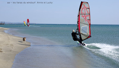 Vendredi, Le Rouet. Une vraie régalade ce matin, vent ouest, plan d'eau plat, trés peu de monde, on peut faire de trés longs runs le long de la plage trés trés près, un moment d'éternité... Le vent faiblit vers 13h30 je change pour 5ms alors que j'étais en 4.4 le matin, vent devenu trés irrégulier avec des coups de nord, mais l'eau est tellement belle et avoir le spot quasi pour soi c'est quand même rare, alors je persiste jusqu'à n'en plus pouvoir . Lucky et moi sommes dans le même état ce soir, on en a profité fond.