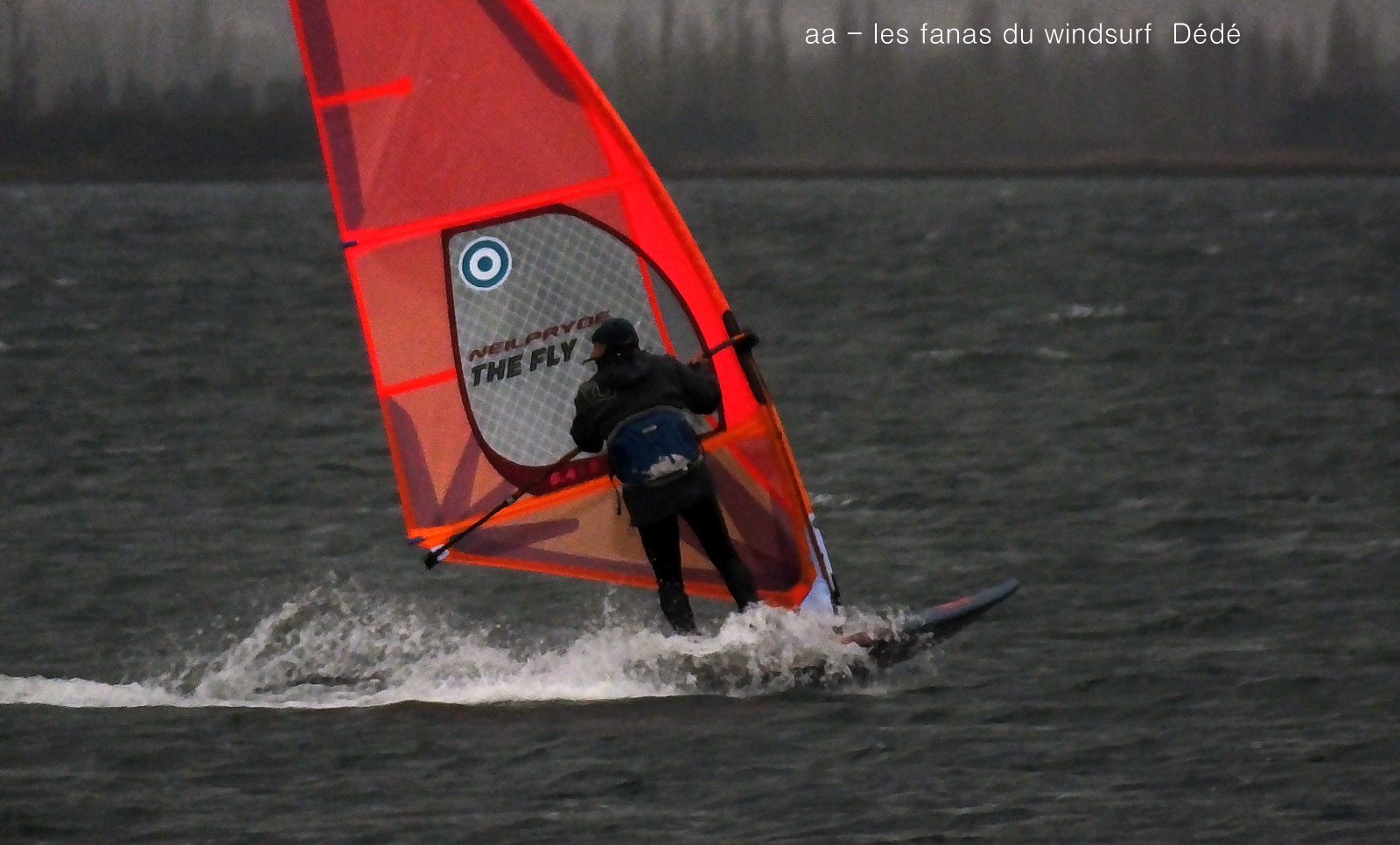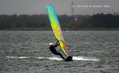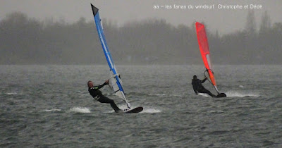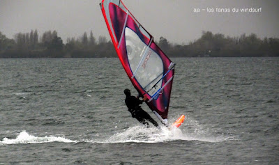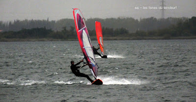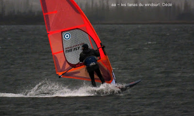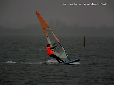 Samedi, Coudalère. La mer est grosse , le vent limite, Dédé est sorti à St Marie en 4.8 sur 113 litres! pour ma part j'avais décidé de rester à Barcares sans trop envie de naviguer, nous sommes restés Toutoune Lucky et moi à jouer pendant 2 bonnes heures, le vent était là mais pas trés régulier. René, Dédé, Gilles et Christophe arrivent, du coup je grée avec eux et je me demande bien pourquoi! en effet il se met à pleuvoir et le vent a baissé d'un cran, pour tout dire je les ai laissé y aller seuls hahaha, pas du tout envie. Désolée pour les photos avec la brouillasse et la pluie même notre appareil n'a pas eu envie!